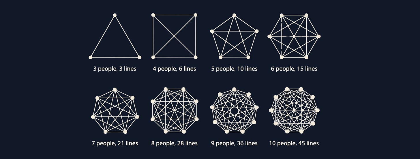 There is a hidden tax on coordination in decentralised systems as they scale. Roles expand, and the number of actors within those roles expands with them. Possible communication paths grow as n(n−1)/2. You get more calls, more chats and more side rooms. With each additional path, the chance that everyone holds the same picture drops and the fog of war increases.