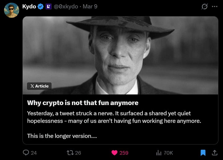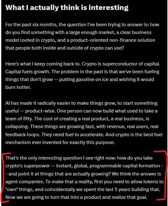 "That's the only interesting question I see right now: how do you take crypto's superpower -- instant, global, programmable capital formation -- and point it at things that are actually growing?" - Kydo