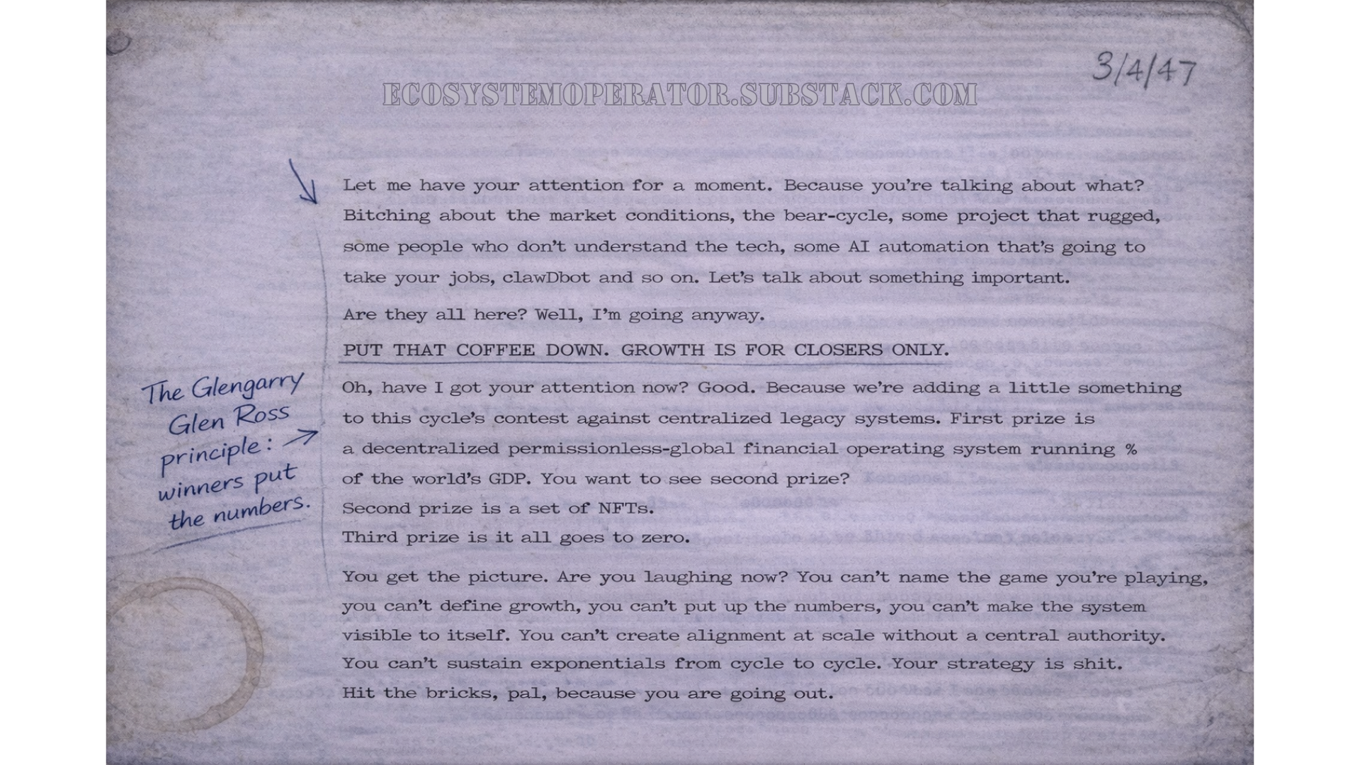 With special thanks to BlockDrops Podcast and fallen-icarus for inspiration, to Steven Paterson for input on treasury deployment mechanics and capital productivity metrics, and to Chris Broveleit, Anton Golub, Petro Golovko, Sc.D., Ph.D. for his ideas on a settlement architecture built around physical assets. Thanks also to Tim Bruckman @Tim38300817, Stay SaaSy, and Nick Almond for ideas, feedback, and conversations that helped shape this piece. As ever, thanks to my Ecosystem Operator collaborator Tim Harrison for the many conversations that have helped inspire some of these ideas.